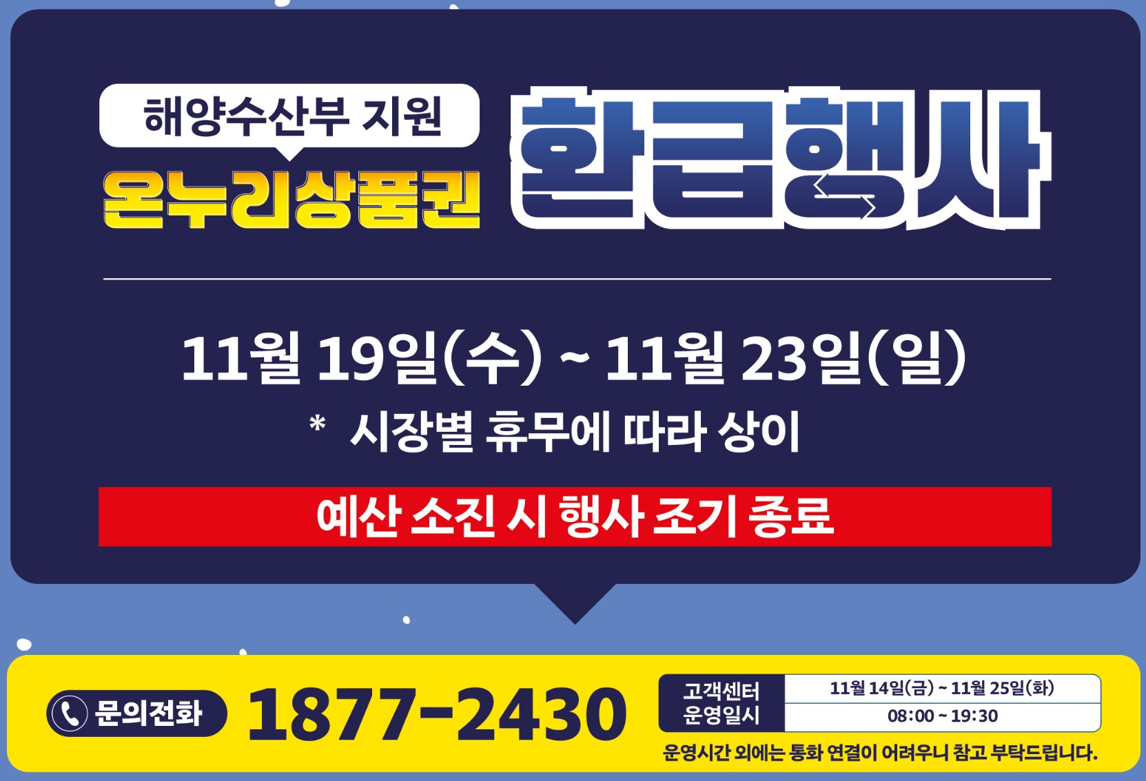 해양수산부는 11월 19일부터 23일까지 전국 125개 전통시장에서 국산 수산물 구매금액의 최대 30%, 1인당 2만 원 한도로 온누리상품권을 환급해드립니다.