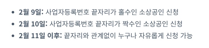 2월 9일에는 사업자등록번호 끝자리가 홀수인 소상공인만 신청할 수 있고, 2월 10일에는 끝자리가 짝수인 소상공인이 신청할 수 있습니다.