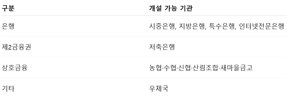 개설 가능한 금융기관은 다음과 같이 매우 폭넓습니다.