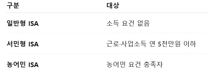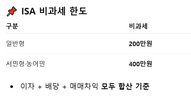 일반형 ISA는 200만 원, 서민형·농어민형 ISA는 400만 원까지 비과세가 적용됩니다.