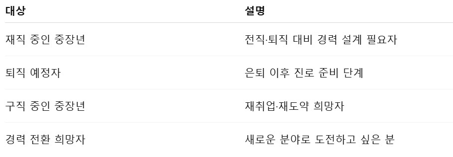 - 퇴직 예정자, 경력 단절자, 재취업 희망자를 대상으로 전직 준비 교육과 취업 연계 프로그램을 제공합니다.