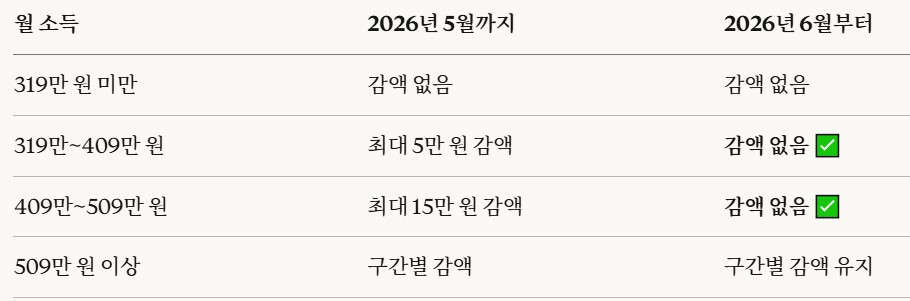 다만 월 소득이 약 509만 원을 초과하는 경우에는 여전히 구간별 감액이 적용됩니다.